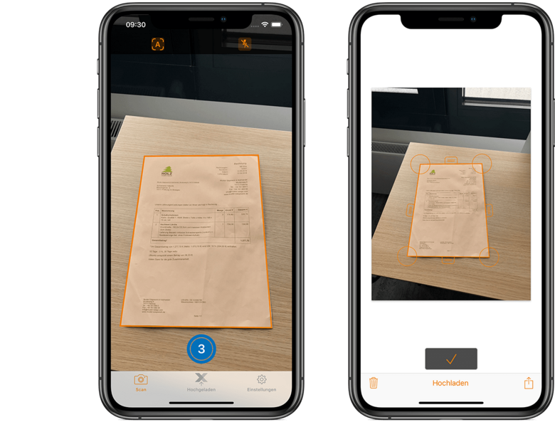 Fotografiere den Beleg (oder die Rechnung) mit dem Smartphone. Die automatische Belegerkennung erkennt die Umrisse der Belege und entzerrt – wenn nötig – den fotografierten Beleg direkt.